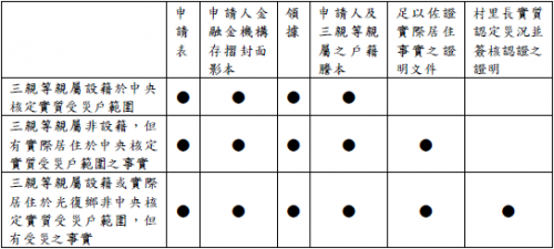 3.如三親等以內之親屬設籍或實際居住區域,非屬中央核定實質受災戶範圍,則應依中央規定,由村里長實質認定災況並簽核認證。