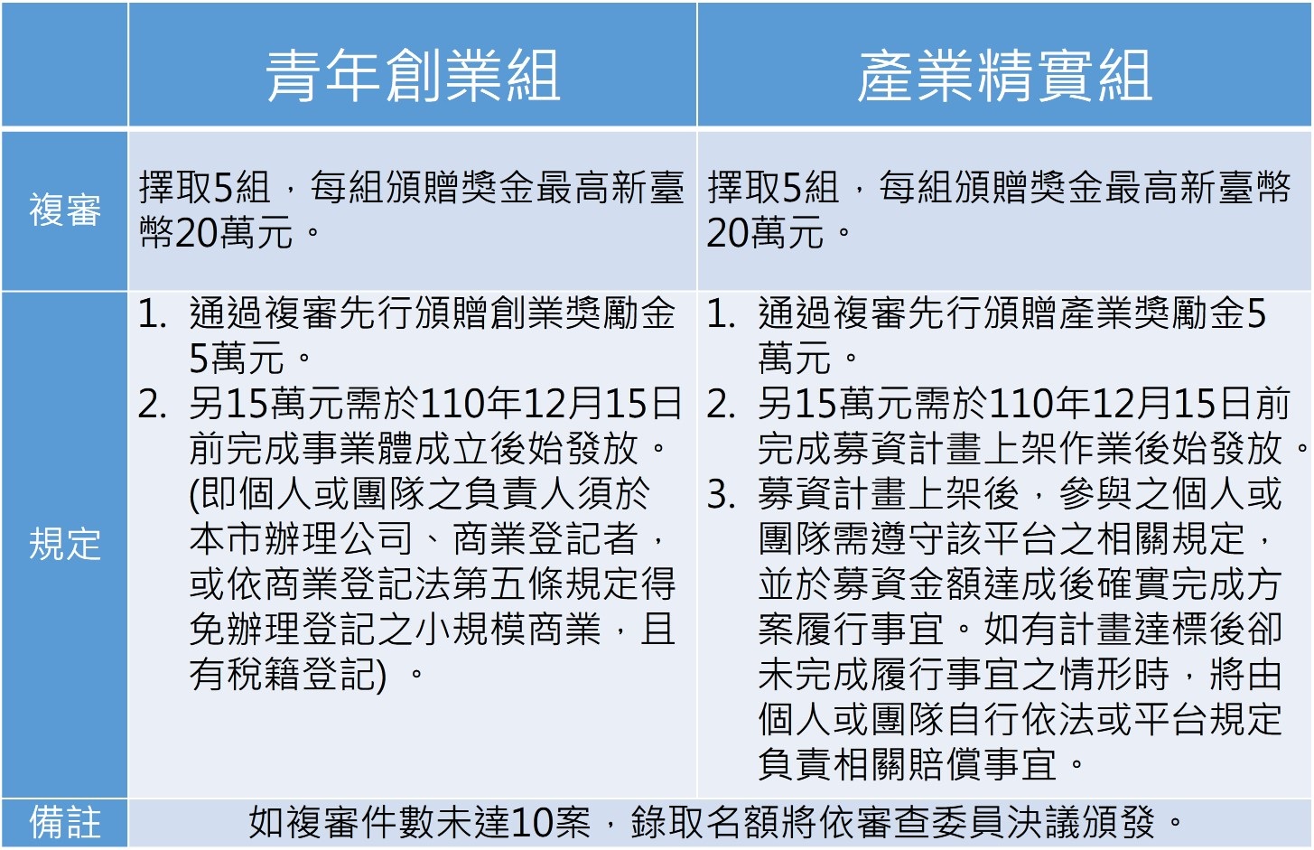 2.產業精實組:需已成立事業體,負責人須年滿20歲,且已於本市辦理公司或合作社商業登記者,或依商業登記法第五條規定得免辦理登記之小規模商業,且有稅籍登者(負責人可不必設籍本市)。108、109年度參與本計畫徵選 之得獎者不得報名。