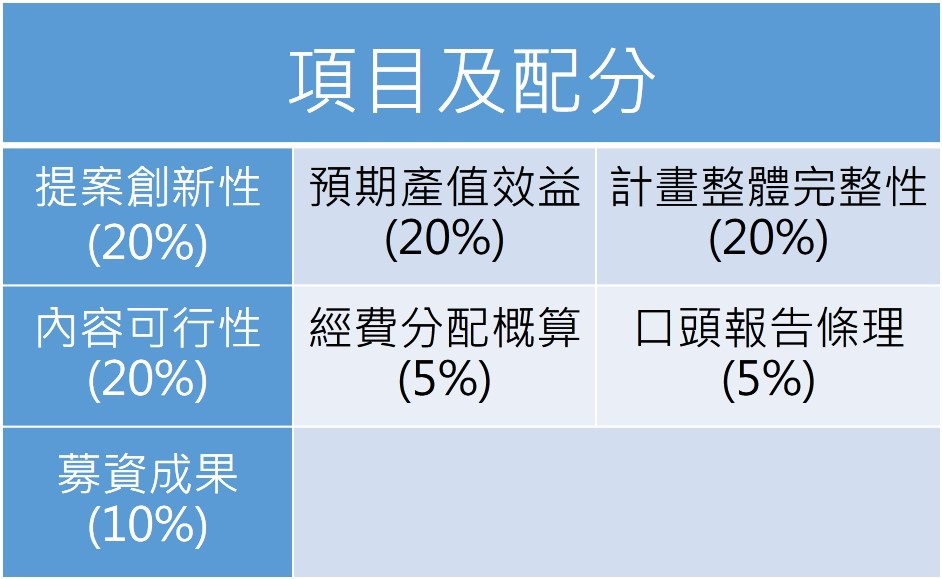 4.募資行動:參與之個人或團隊須於複審前完成募資計畫,計畫亦列入複審委員評分項目。