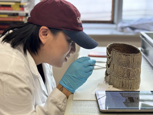 ▲烏來泰雅民族博物館文專人員Loba・Yumin仔細記錄漂流至歐洲的珍貴貝珠頭飾藏品。(圖/新北市政府原民局提供)