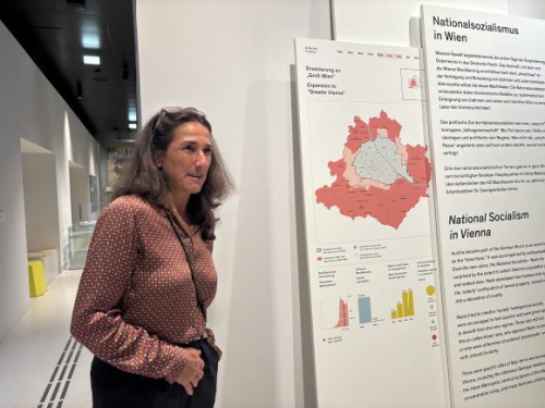 ▲維也納市博物館財務暨營運總監Christina Schwarz於常設展區介紹維也納市人口分布。(圖/新北市政府原民局提供)