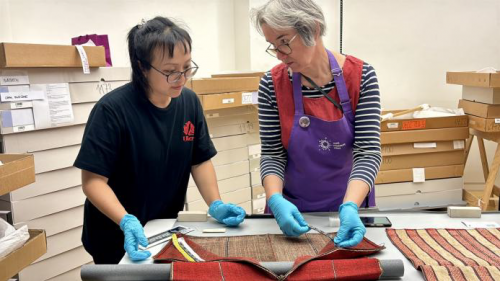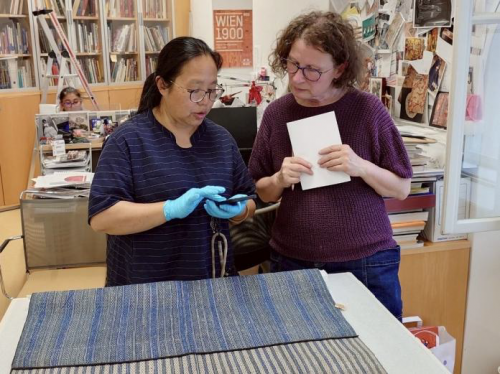 ▲烏來在地青年織者高玉玫(左)與維也納世界博物館織品維護負責人 Barbara Pönighaus-Matuella(右)討論織紋細節與結構。(圖/新北市政府原民局提供)