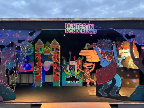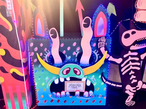 走入燈區,可見張牙的山豬、咧嘴而笑的大黑熊、張嘴嚇人卻帶著反差萌的石虎、佇立樹幹上的草鴞、傳遞訊息的希利克鳥,以及盤旋夜空的蝙蝠,整座山林顯得熱鬧而生動,獵人身旁還跟著兩隻忠誠的獵犬,讓觀眾宛如誤闖一場動物們的夜間派對,藝術家蔣沛珊Yabun Yuma的作品蘊含族群文化的細膩提醒,當觀眾走近作品,打開黑熊的手掌,會看見來自泰雅族的溫馨叮嚀;而希利克鳥在泰雅族傳統文化中,象徵獵人出獵前的重要指引,若鳥鳴悅耳,便代表環境安好、行動順利,展現族人與自然相互傾聽的智慧。